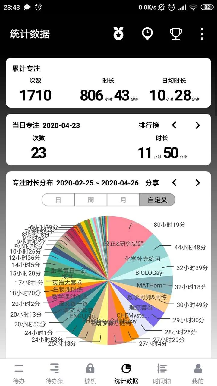 我的措施算是有效的。我逐渐适应了在家学习的日子,但还是不可避免地容易分心,学习时间仅有8-9小时,学习效率也难与学校同日而语。宅家学习7天后,我发现效率低下的原因可能是对于一天的任务量没有概念,以至于没有合理的时间分配。于是我又到知乎找了一波,找到了”番茄to do“,本来想找Todo list,想不到找到了一款个人提升助手,集番茄钟,锁机,励志语录,数据收集,小憩于一体,还有自习室功能让你跟其他同学们比拼学习时间!天,太对我胃口了。