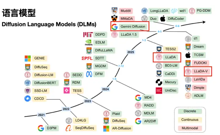 可以看见从Diffusion诞生起(2021年),学界就开始了语言diffusion的探索,此前一直是尝试将文本连续化,让模态适应算法,直到2024年,让算法离散化才逐渐登上舞台。到了2025年,学界的LLaDA、业界的Gemini Diffusion才逐渐进入我们的视野。