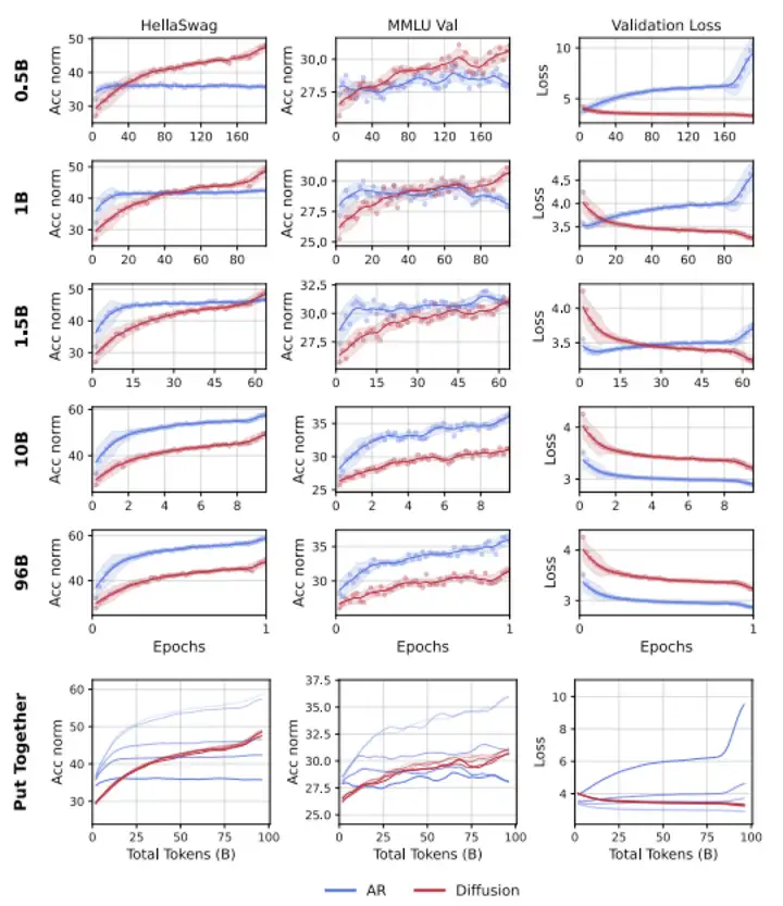 通过大量对照实验,研究发现了一个显著的”智能交叉”现象:当独特数据量有限时,扩散语言模型(DLMs)在性能上持续超越相同规模的自回归模型(AR)。具体而言,DLMs表现出超过3倍的数据效率 - 在相同的总token预算下,用0.5B独特token训练的DLM能够达到用约1.5B独特token训练的AR模型的性能水平。