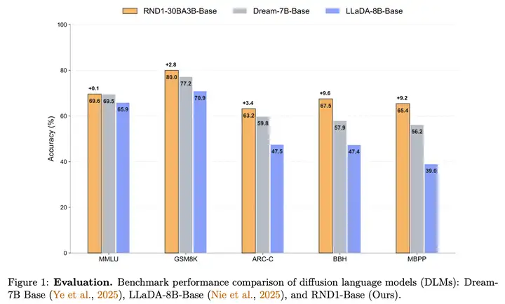 Training DLMs at Scale using Autoregressive Models,初创公司Radical Numerics 在今年10月的工作,开源了目前最大,性能最好的DLM模型RND1 。