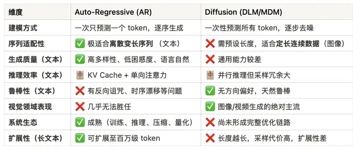 这篇文章从算法的角度,通过大量实验说明DLM和ARM在文本理解生成任务中有各自擅长的区间,但是,从扩展性和上限来看,ARM是优于DLM的。本文局限在于,毕竟是学术界文章,训练规模太小,因此该论断的适用范围仅限3B左右的小模型。